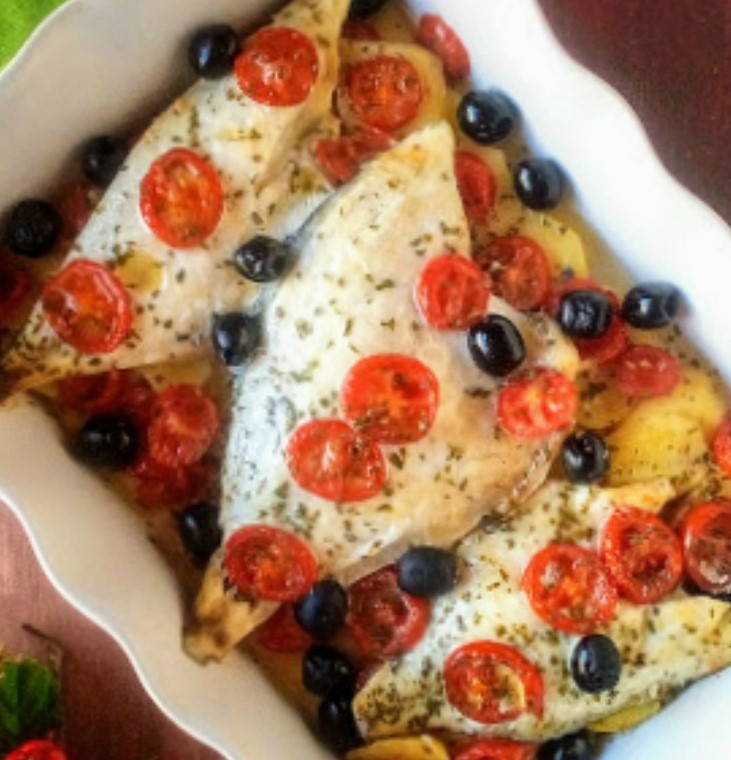 Filetti di orata al forno con patate e olive nero – Baked Sea Bream Fillets with Potatoes and Black Olives.